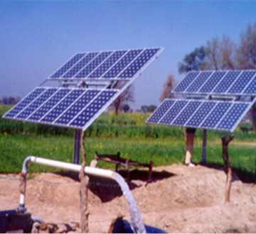 A solar-powered pump is a pump running on electricity generated by photovoltaic panels or radiated thermal energy available from collected sunlight as opposed to grid electricity or diesel run water pumps. The operation of solar powered - pumps is more economical mainly due to the lower operation and maintenance costs and has less environment impact than pumps powered by an internal combustion engine (ICE). Solar pumps are useful where grid electricity is unavailable